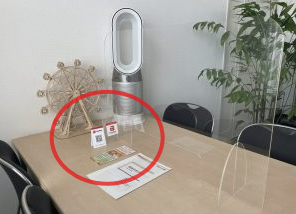 ↑事務所のデスクにQRコードのポップを置いております。