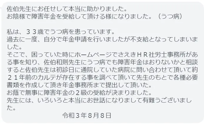 返戻もなく、障害基礎年金2級が決定しました。ご本人様はもちろん、お父様も大変喜んで頂けました。就労継続支援A型で就労されていますが、無理をせずに治療も継続したいと安心されています。